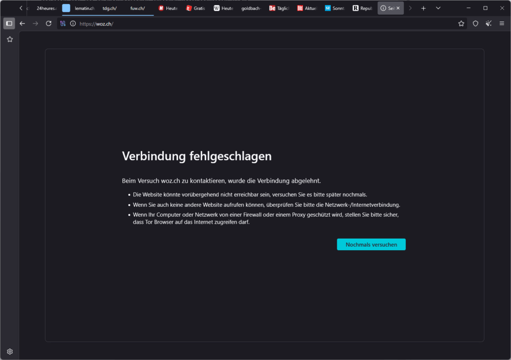 Auch hier: die WOZ war über die kommerziellen VPN-Dienste erreichbar, nicht aber über das Tornetzwerk. Vielleicht derselbe Webhoster wie die Tamedia-Medien?